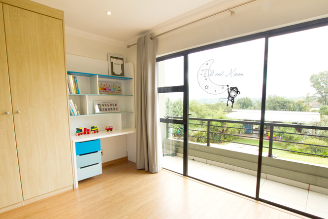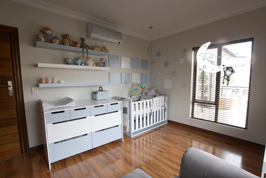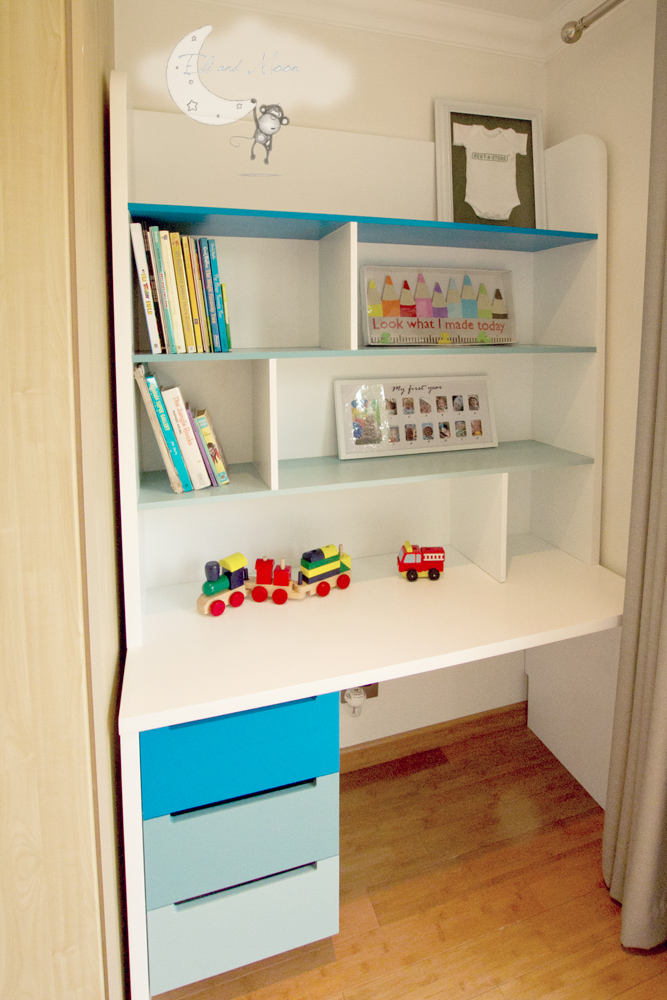 – Floating shelves in white and blue/grey duco finish
