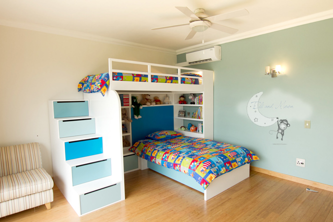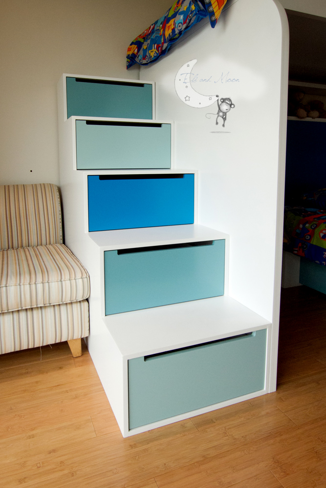 7 piece unit with 4 duco colours, drawer steps, bookshelves, headboard, bedside table, rail, 2 beds and under-bed storage